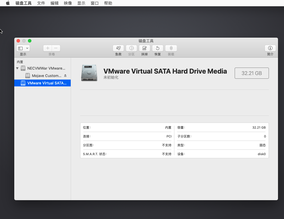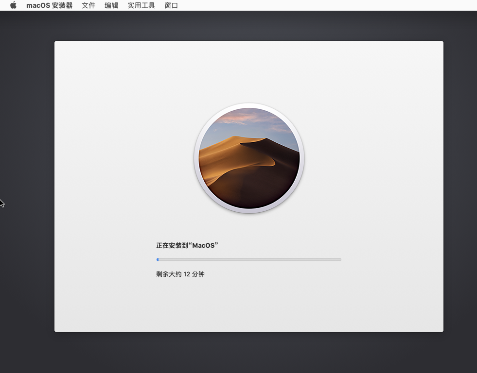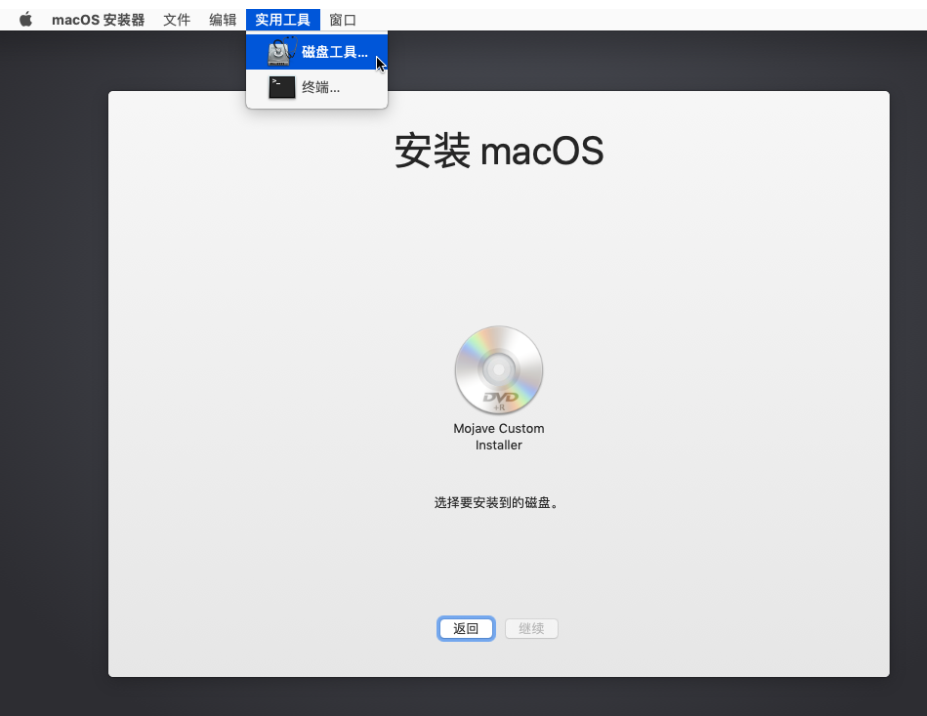 进行到这一步之后无法再进行下去,是因为我们还没有分区,点击实用工具>磁盘工具 选中硬盘先点击抹掉然后再点击分区